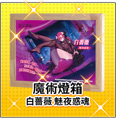 抽獎所得實體獎勵,包含「魔術燈箱-白薔薇 ( 魅夜惑魂 )」與「壓克立牌-白薔薇 ( 原皮 )」二合計1次;源晶輝錠x300最高10 次。若該獎勵達到上限,系統將自動遮蔽抽取其他獎勵。